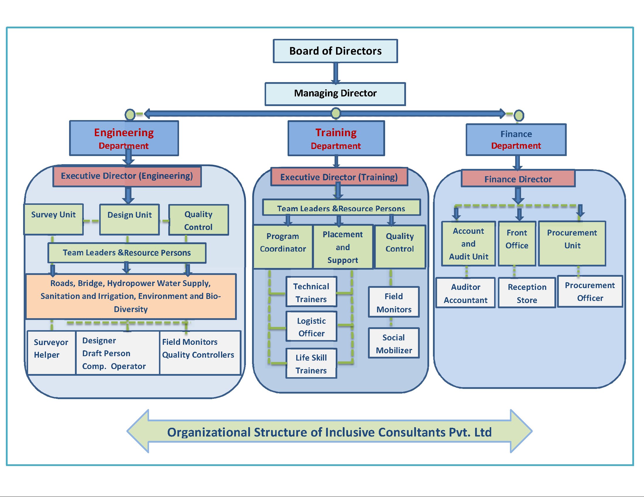 Board of Directors operating the company are experienced, qualified, and energetic . Policies, strategies, priorities of each project are set by the board of directors . Most of the section chiefs are the promoter member of board of directors, and the firm. The firm has full time and Resources staffs whose service are acquired as per the requirement for each specific project. The day-to-day management is handled by the the managing director elected by the promoters of the company.